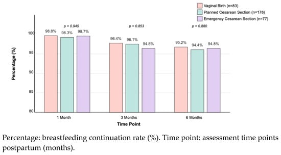By one month postpartum, breastfeeding continuation rates were similarly high across the groups (vaginal: 98.8%, planned C/S: 98.3%, emergency C/S: 98.7%; p = 0.945). These high rates persisted at three months (vaginal: 96.4%, planned C/S: 96.1%, emergency C/S: 94.8%; p = 0.853) and six months postpartum (vaginal: 95.2%, planned C/S: 94.4%, emergency C/S: 94.8%; p = 0.880) (Figure 2). No significant differences were found between the groups in breastfeeding continuation rates at these later time points, highlighting that early disparities in initiation were transient (Figure 2).