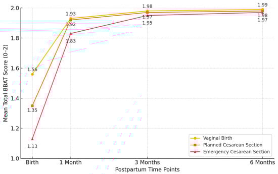 Repeated measures ANOVA demonstrated significant improvements in BBAT scores within each delivery group over time (p < 0.001 for all groups). The emergency cesarean section group exhibited the largest relative improvement in total BBAT scores from birth to six months (74.3% increase), followed by planned C/S (46.7%) and vaginal delivery (27.6%). A significant time × delivery method interaction (p < 0.001) indicated differential recovery trajectories among the groups (Table 4).