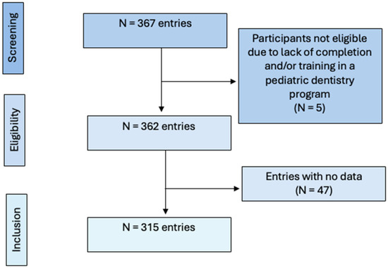 Out of 367 total responses, 5 (1.4%) derived from participants who did not complete or were not currently completing a specialized training in pediatric dentistry, while 47 (12.8%) were submitted without any data. Thus, these entries were excluded from the final analysis, leaving a total of 315 participants (Figure 1). Based on 315 completed surveys out of approximately 6500 reachable AAPD members, the response rate was 4.8%.