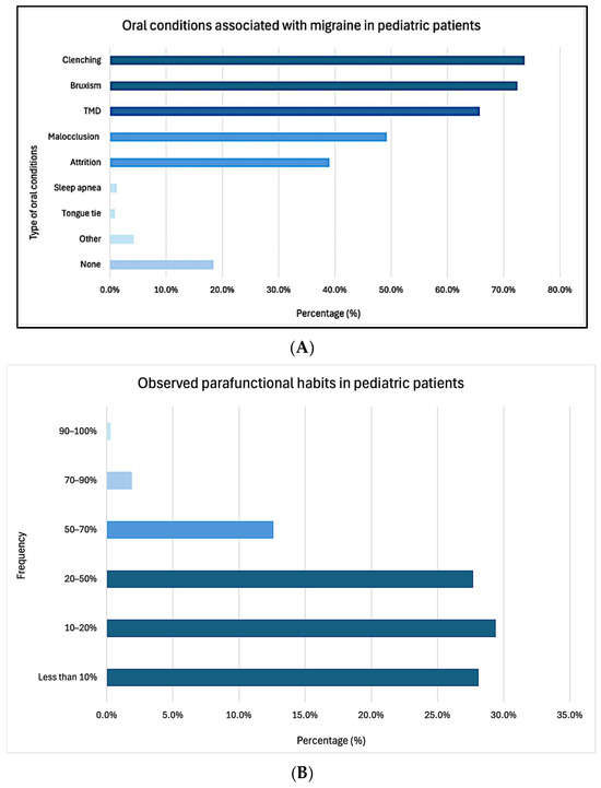 Type of oral conditions perceived to be associated with headache/migraine in pediatric patients (A), frequency of observed parafunctional habits (B).