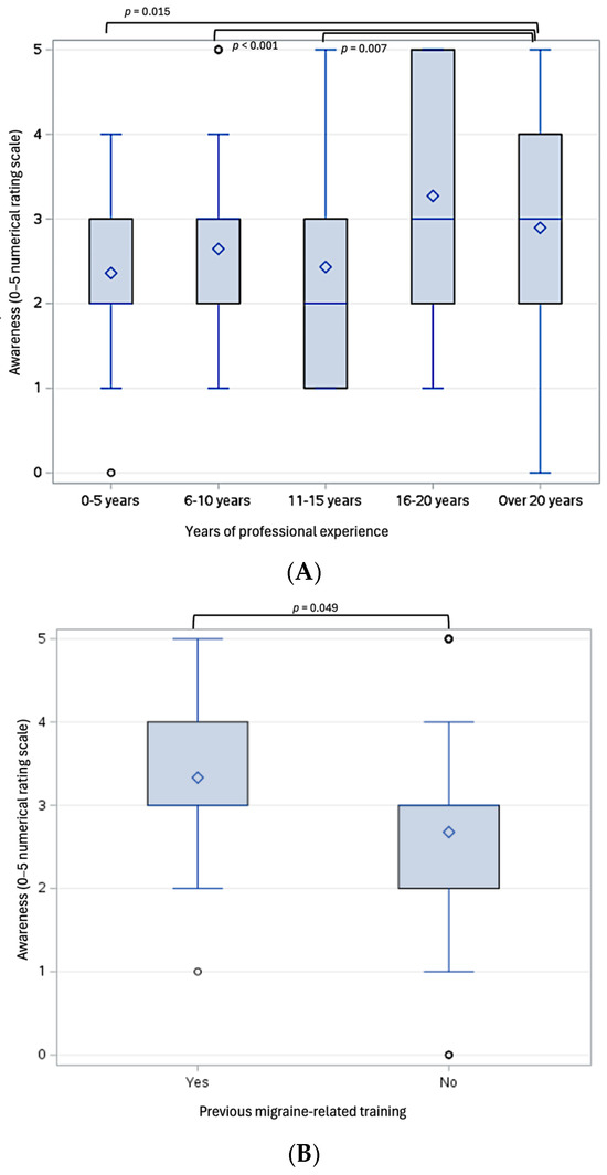 Pediatric dentists with over 20 years of experience reported significantly higher awareness of this connection (4.5 ± 0.9) compared to those with 0–5 years (3.3 ± 1.7, p = 0.015), 6–10 years (2.9 ± 1.8, p < 0.001), and 11–15 years of experience (3.3 ± 1.8, p = 0.007, Figure 3A). These differences in awareness occurred despite no significant differences in reported training on the role of pediatric dentists in migraine prevention or management during their education (X2(4) = 1.176, p = 0.882).