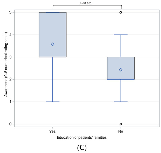 A large majority (95.2%) indicated that their formal educational background did not include training on the role of pediatric dentists in headache/migraine prevention or management. Only 34.2% felt they were equipped with resources to address the potential oral health–headache/migraine connection. Respondents who reported being equipped with such resources demonstrated significantly higher awareness of their link compared to those who were not (3.4 ± 1.3 vs. 2.4 ± 1.1, p < 0.001, Cohen’s d = 0.91). Similarly, only 24.4% reported educating families on the relationship between oral conditions and headache/migraine in their pediatric patients. Those who had received headache/migraine-related training (N = 15) and those who reported educating families on the oral condition–headache/migraine connection (N = 77) also demonstrated significantly higher awareness compared to those who did not receive any training (3.3 ± 1.1 vs. 2.7 ± 1.3, p = 0.049, Cohen’s d = 0.52, Figure 3B) and those who did not educate the families on such a link (3.6 ± 1.2 vs. 2.4 ± 1.1, p < 0.001, Cohen’s d = 0.99, Figure 3C).