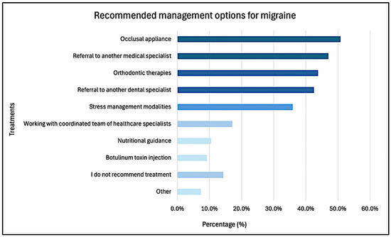 The most common recommended approaches for headache/migraine management included nighttime occlusal appliances (50.8%), followed by referral to medical (47.0%) and dental (42.5%) specialists, orthodontic therapies (43.8%), and stress management strategies (35.9%, Figure 4).