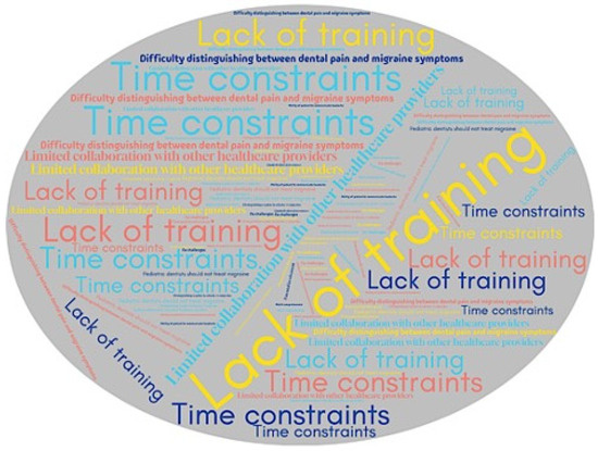 Word cloud illustrating the reported challenges in implementing headache/migraine management into pediatric dentistry practice. Larger size and more frequently repeated items reflect challenges more commonly mentioned by respondents.