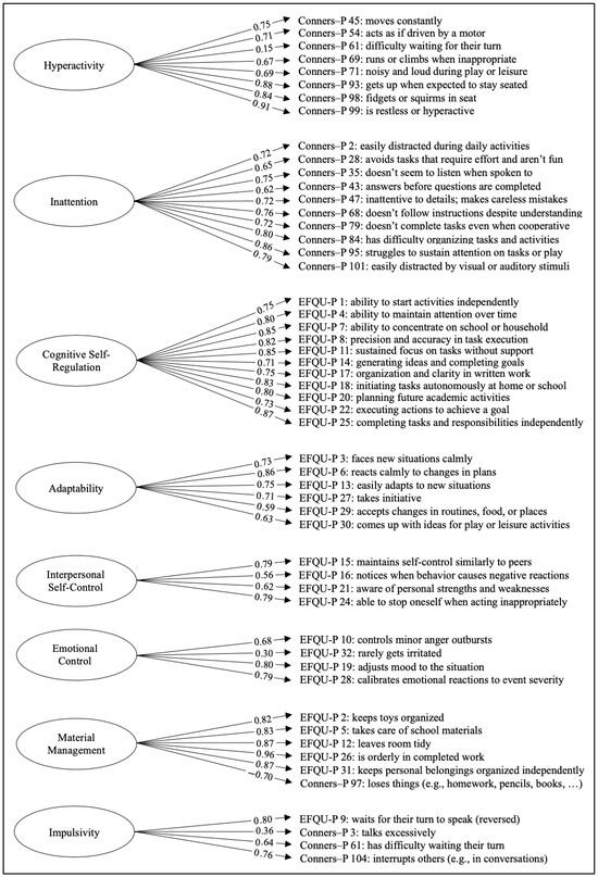 Following the EFA, eight latent factors were identified and retained for the confirmatory analysis. Before proceeding with the CFA, the factor structure was examined conceptually to ensure theoretical coherence across constructs. To improve conceptual clarity, a refinement of the factor structure was applied. Specifically, two items, originally loading on the Adaptability factor (EFQU-P 19 and EFQU-P 28), were reassigned to the Emotional Control factor, with the aim of both clarifying the former and strengthening the latter. Notably, both reassigned items (EFQU-P 19 and EFQU-P 28) loaded strongly on the Emotional Control factor in the CFA (standardized loadings = 0.79 and 0.80, respectively), providing empirical support for the theoretical rationale behind the reassignment. Additionally, the EFQU-P 9 item was reversed to align with the directionality of the other items in the impulsivity factor. The CFA (Figure 1) was then conducted on this revised eight-factor model. The model showed a good fit to the data: χ2(1245) = 3927, p < 0.001, CFI = 0.982, TLI = 0.981, RMSEA = 0.061, SRMR = 0.062. All standardized loadings were statistically significant and above 0.30, except for one item (Conners–P 61), supporting the adequacy of the proposed structure. The low standardized loading of the Conners–P 61 item may be due to its ambiguous content, which, in the EFA, showed moderate cross-loadings on both the Hyperactivity and Impulsivity factors. Although its CFA loading was low, the item was retained within the Hyperactivity factor, given its stronger EFA saturation and theoretical alignment with the original subscale structure of the Conners Rating Scales. Additionally, to assess internal consistency, Cronbach’s alpha coefficients were computed for each scale (Table 3). All factors demonstrated acceptable to excellent reliability, with α values ranging from 0.71 (Emotional Control) to 0.94 (Cognitive Self-Regulation). For clarity, only standardized item loadings are displayed in the path diagrams (Figure 1 and Figure 2). Correlated residuals and inter-factor correlations are not shown.