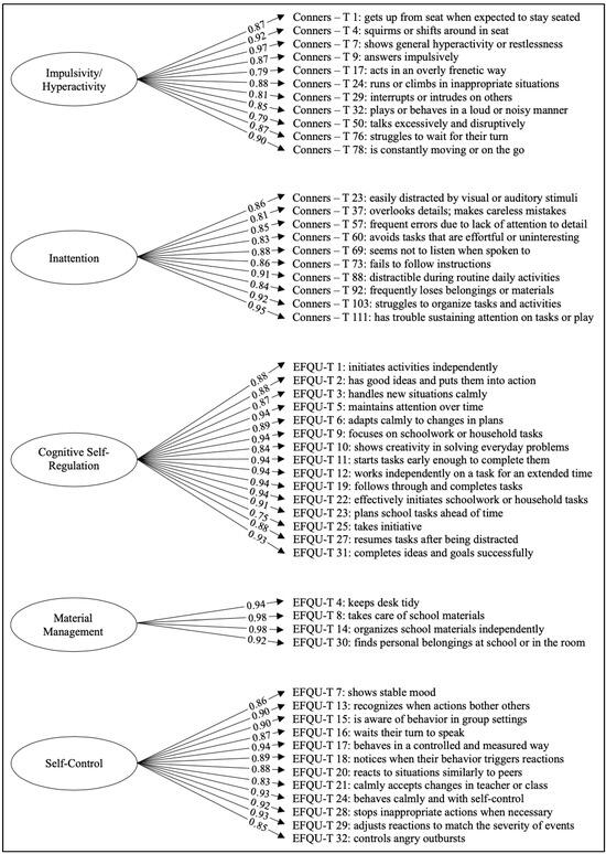 Before proceeding with the CFA, the factor structure was examined conceptually to ensure theoretical coherence across constructs. To improve conceptual clarity, a refinement of the factor structure was applied: the EFQU-T 6 item, originally solely loading on the Adaptability factor, was reassigned to the Cognitive Self-Regulation factor, on which the EFQU-T 6 item had the second-highest load. Additionally, this modification was theoretically motivated, as EFQU-T 6 refers to sustained effort and goal-directed persistence—core components of cognitive self-regulation. The empirical adequacy of this choice was supported by the CFA, where the item showed a strong standardized loading on the new factor (λ = 0.89). The CFA (Figure 2) was then conducted on this revised five-factor model. The model showed a good fit to the data: χ2(1264) = 7343, p < 0.001, CFI = 0.994, TLI = 0.994, RMSEA = 0.080, SRMR = 0.066. All standardized loadings were statistically significant and above 0.30, supporting the adequacy of the proposed structure. Additionally, Cronbach’s alpha coefficients (Table 4) demonstrated excellent reliability, with α values ranging from 0.94 (Impulsivity/Hyperactivity) to 0.97 (Cognitive Self-Regulation and Self-Control).