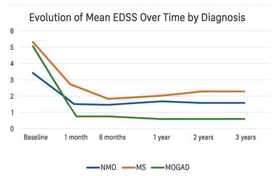 Over time, outcome trajectories diverged significantly across diagnoses. MS showed the most unfavorable progression in terms of disability: although initial improvement occurred during the first 6 months, EDSS progressively increased from the first year, consistent with cumulative disability in a chronic disease. MOGAD, in contrast, displayed a sharply favorable course, with rapid and sustained EDSS improvement and low long-term scores, indicating a positive prognosis and supporting a monophasic or fully remitting phenotype in most cases. NMOSD showed high disability at onset with limited recovery and variable stability.
