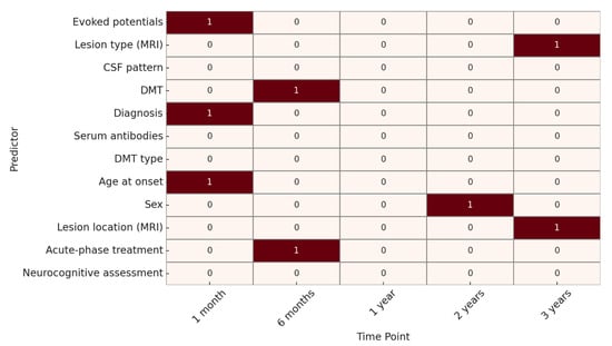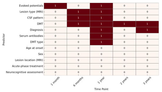 For EDSS progression, at 1 month, the only variable significantly associated with outcome was the presence of abnormal evoked potentials. At 6 months, significant predictors included lesion type on MRI, CSF oligoclonal band pattern, and DMT. At 1 year, significant variables were evoked potentials, lesion type on MRI, CSF pattern, diagnosis, presence of serum antibodies, use of DMT, and DMT type.