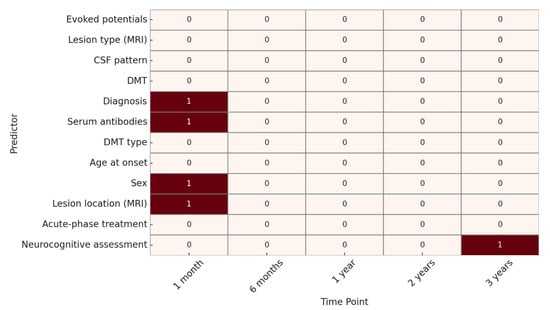 Regarding neuroradiological progression, at 1 month, significant predictors were age at onset, evoked potentials, and specific diagnosis, when already defined through specific biomarkers, such as MOG or AQP4 antibodies. At 6 months, acute-phase treatment and DMT were significant. At 1 year, no factors reached statistical significance. At 2 years, only sex was significantly associated, while at 3 years, lesion type and lesion location on MRI were identified as significant predictors. (