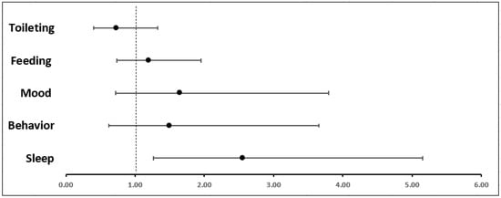 Signs of stress presented in all five domains in both groups (Table 2). However, sleep difficulties were more prevalent during the COVID-19 pandemic for all age groups (14% vs. 6.5%, p = 0.013). Concerns in all other domains were more prevalent during the study period, apart from changes in toileting, but did not reach significance. This held true even when adjusted for age, gender, and insurance type (Figure 1), as children of all ages were 2.56 times more likely to present with sleep difficulties during the pandemic period as compared to the control period (OR = 2.56, 95% CI [1.27, 5.15], p = 0.009).