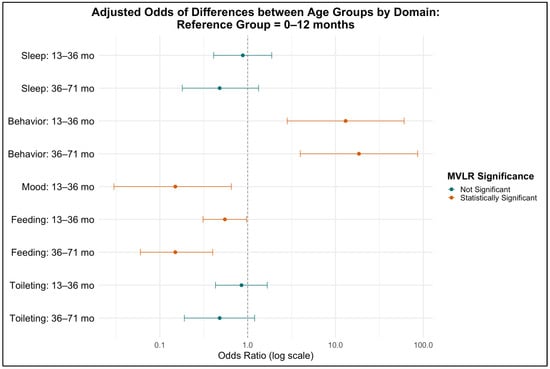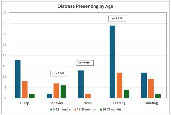 Although concerns in all five domains were present during the study period, there were differences in how stress presented within different age groups. Stratified by age, mood changes/fussiness (p = 0.019) and feeding difficulties (p = 0.014) were more prevalent in infants (0–12 months), whereas toddlers (13–35 months) and preschool-aged children (36–71 months) were more likely to present with behavior concerns (p = 0.006) (Figure 2).