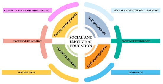 Theoretical framework of Social and Emotional Education. This figure illustrates the conceptual framework of Social and Emotional Education []. At the core of the model are four areas of competence: self-awareness, self-management, social awareness, and social management. These competencies are underpinned by six complementary theoretical approaches: social and emotional learning, positive psychology, resilience theory, mindfulness education, inclusive education, and caring classroom communities.