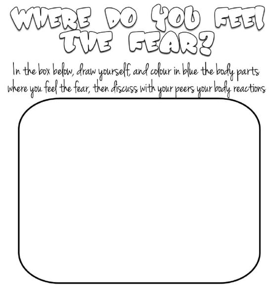 The image provides an example of an activity from the second core area of the SEE framework, specifically focused on self-management. The activity invites children to reflect on how fear is experienced in their bodies. In the provided worksheet, children are instructed to draw themselves inside the outlined box and to colour in blue the body parts where they feel fear. They are then encouraged to discuss their bodily reactions with peers. The primary objective of this activity is to promote emotional and bodily awareness, supporting children in recognising the physical sensations associated with fear and providing strategies for self-regulation.