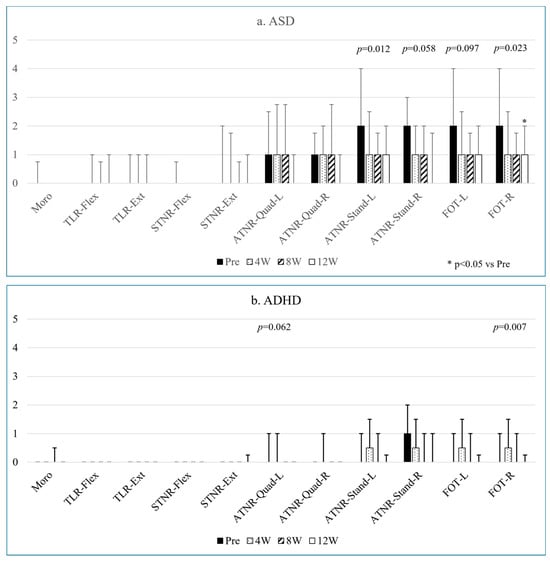 Changes in the persistence levels of various primitive reflexes and FOT in ASD (a) and ADHD (b) over twelve weeks.