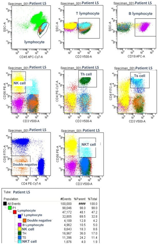 Interpretation Based on Pediatric Reference Values: It is important to note that the lymphocyte subgroups analyzed using flow cytometry do not have universally established reference values in pediatric populations; instead, the average values vary with age and developmental stage. Therefore, the lymphocyte subset results were interpreted within age-appropriate reference ranges and categorized as normal, elevated, or decreased accordingly [17].