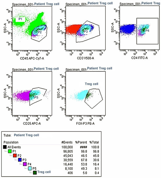 Regulatory T Cell (Treg) Analysis: For the analysis of regulatory T cells, lymphocytes were gated using the CD45 vs. SS plot. T lymphocytes were selected from the CD3 vs. SS plot, followed by the selection of CD4+ T helper cells from the CD4 vs. SS plot. Treg cells were identified by analyzing the expression of CD25 and FoxP3 within the CD4+ T cell population. As with the previous analysis, the percentage of Treg cells was recorded, and the absolute Treg cell counts per microliter were calculated using the patients’ total leukocyte counts.
