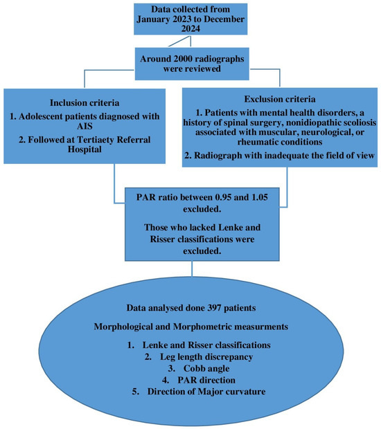 This retrospective, cross-sectional study was conducted using archived radiographic images of patients diagnosed with adolescent idiopathic scoliosis (AIS) who received treatment at a Tertiary Referral Hospital between January 2023 and December 2024. The study was conducted in accordance with the Declaration of Helsinki. Ethical approval dated 15 May 2024 and numbered 2024/162 was obtained from the Ethics Committee for Non-Invasive Clinical Research of Gaziantep University. Approximately 2000 radiographs were reviewed during the archive search. The study was conducted following STROBE guidelines for retrospective cross-sectional studies [12] (Figure 1).