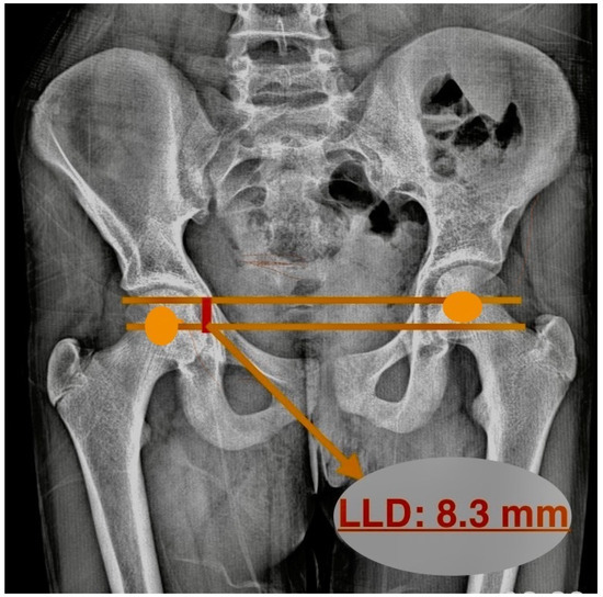 The LLD was determined by drawing two parallel lines between the centers of the femoral heads. Then, the distance between these lines was measured, and LLD was calculated (Figure 3). Pasha et al. determined this value as the inclination of the bifemoral head axis and substituted it for LLD. While this reflects the apparent limb length, it is susceptible to pelvic tilt and may not represent the true anatomical leg length discrepancy [17].