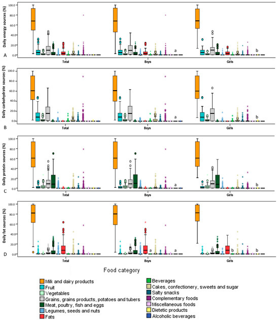 Relative contribution of each food category to the daily energy and macronutrient intake of infants from the National Food Consumption Survey on Infants and Children: (A) daily energy intake; (B) daily carbohydrate intake; (C) daily protein intake; (D) daily fat intake. Bars with different letters indicate statistically significant differences between the sexes (Mann-Whitney U test; p < 0.05). * Values that are more than 3.0 of interquartile range or above the third quartile.