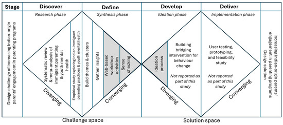 The DD framework [33,34] provides a structured approach to systematically explore problems and develop solutions through a four-stage process: the research phase (Discover), the synthesis phase (Define), the ideation phase (Develop), and the implementation phase (Deliver). A diverse range of prior research has used this framework to develop a telehealth peer support program for caregivers of individuals with dementia [35]. DD is particularly well-suited to culturally complex design problems, as it enables an iterative engagement with diverse stakeholders, such as Indian-origin families, allowing for an in-depth exploration of parental factors and cultural practices, synthesis of insights into culturally grounded problem definitions, and the co-creation of socially responsive and contextually appropriate solutions. As this study requires a systematic approach to understand the limited engagement of Indian-origin parents in parenting programs, and to develop a bridging intervention to empower, support and increase their engagement in parenting programs in Australia, the DD framework was deemed to be an optimal option due to its capacity to guide culturally responsive and inclusive intervention design.