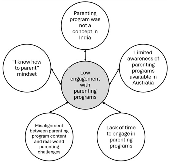 As presented in Figure 2, the central theme, ‘low engagement with parenting programs’, encompasses five underlying factors that represent key barriers that explain the low engagement of Indian-origin parents in parenting programs.