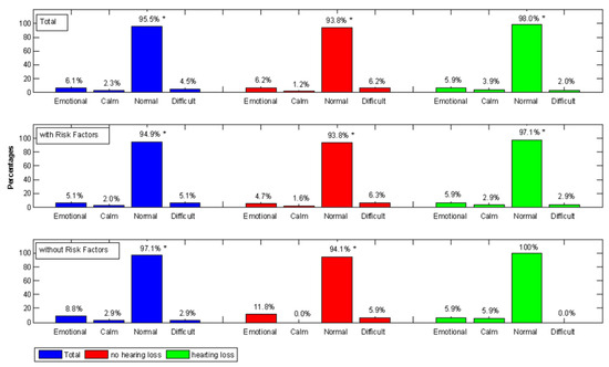 Temperament type of infants with and without hearing loss, considering infants with and without risk factors. The asterisk represents a significant percentage.