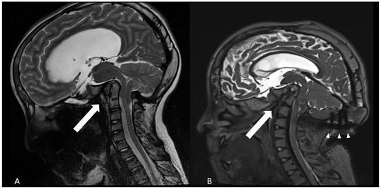 Progressive basilar invagination and flattening of the calvaria as shown by sagittal T2-weighted MRI. (A): age of 12 years (B): 18 years old. The arrows point to the angle between clivus and dens axis, diminishing from about 75° to 50°. Arrowheads show the occipital instrumentation.
