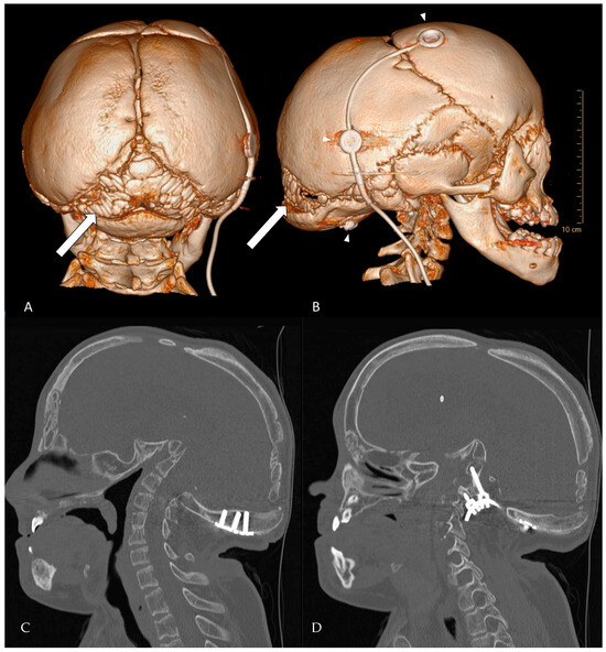 - Cutler, C.B.; Li, D.; Ruge, J.R. Cranial vault suspension for basilar invagination in patients with open cranial sutures: Technique and long-term follow-up. Illustrative case. J. Neurosurg. Case Lessons 2023, 6, CASE23552. [Google Scholar] [CrossRef] [PubMed]