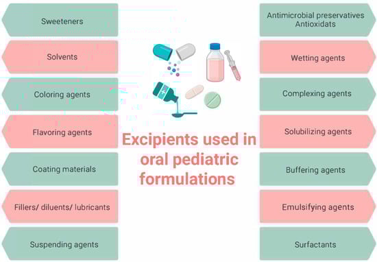 45]. Almost all drug formulations contain excipients that are tested for quality according to official standards. However, these standards are mainly made for adults and do not always guarantee safety or suitability for children [