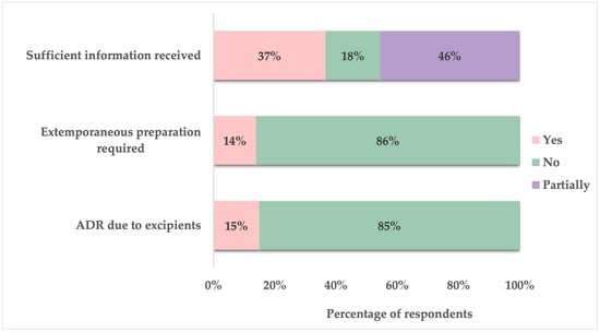 Approximately 15% of parents reported that their child had experienced an ADR due to pharmaceutical excipient included in the oral dosage form. Additionally, 14% indicated that it had been necessary for their child’s medication to be prepared as an extemporaneous formulation in a pharmacy. When asked about the medication-related information received from healthcare providers (physicians and pharmacists) regarding their child’s oral medications, only 37% of parents felt sufficiently informed, while 46% stated that they only partially received adequate information. The remaining 18% reported not receiving enough information (