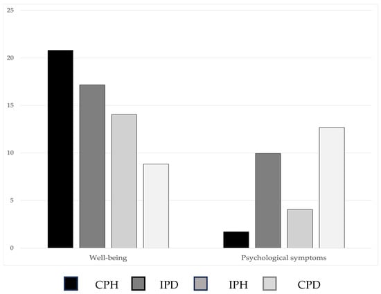 Group comparisons for well-being and psychological symptoms according to clusters. CPH = Complete Psychological Health; IPD = Incomplete Psychological Distress; IPH = Incomplete Psychological Health; CPD = Complete Psychological Distress.