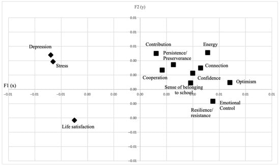 Thus, the first (x) and second (y) functions were defined on the positive side by contribution, persistence/perseverance, energy, connection, confidence, sense of belonging to school, cooperation, and optimism, while the second function (y) was defined, also on the positive side, by depression. The first function (x) was also defined on the negative side by depression and stress, while the second function (y) was defined on the negative side by life satisfaction (see Figure 2).