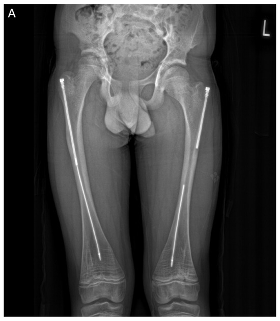- Nguyen, C.V.; Makarewich, C.A.; Poon, S.C.; Cho, R.H.; Hennessey, T.A. Long-term Outcomes of Intramedullary Nails in Osteogenesis Imperfecta: Fewer Surgeries and Longer Survival Times With Telescoping Rods in Patients With Over Ten Years Follow-up. J. Pediatr. Orthop. 2025, 45, 51–55. [Google Scholar] [CrossRef] [PubMed]