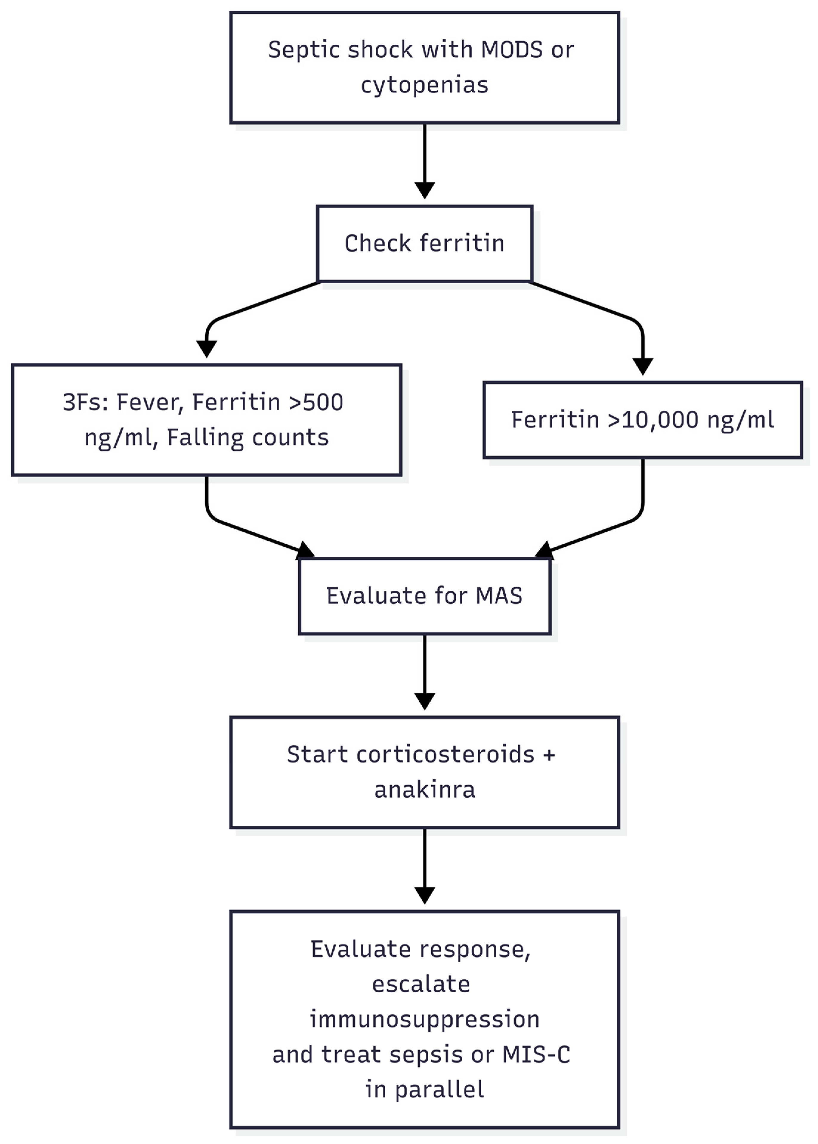 Therapeutic escalation | If MAS/HLH strongly suspected | Initiate corticosteroids ± anakinra early; continue antimicrobial coverage in parallel | Lee et al., 2024 [4]; Rajasekaran et al., 2014 [18]; Shakoory et al., 2016 [39] |