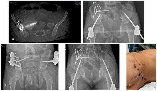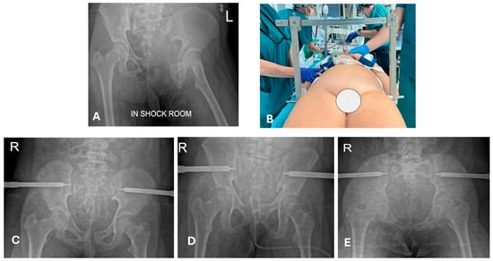 A 12-year-old girl, after high-energy trauma (motocross accident: direct frontal collision with a tree during a jump). (A) Unstable open pelvic ring fracture. The patient was hemodynamically unstable upon admission. The exposure of the fracture was in a cavity (the left pelvic ramus protruded through the vagina), which is a lesion that might be easily missed during the primary evaluation without a systematic approach and exposure of the patient. (B) Pelvic fixation in an emergency with a pelvic C-clamp. (C–E) Postoperative radiographs (antero-posterior and outlet and inlet views, respectively). The patient survived and followed definitive treatment in the following days. Courtesy of Dr Garcia Parra C. and Pelis A (Papa Giovanni XXIII Hospital, Bergamo), with permission.