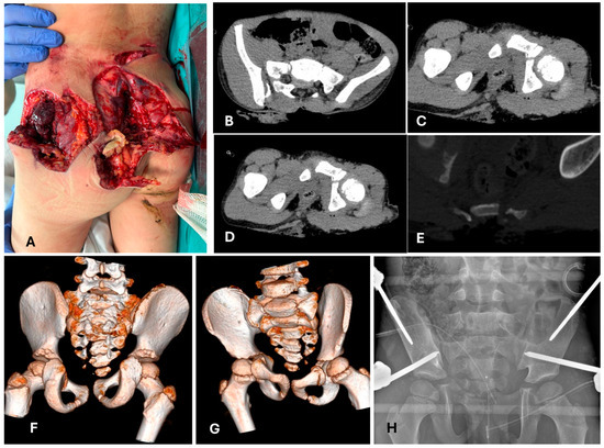 A 7-year-old patient, pediatric major trauma (PMT), accidentally run over by a snowcat. (A) Clinical presentation of the open sacral and pelvic fractures (back-view). (B–E) Computed tomography at admission; triplanar and (F,G) 3D reconstruction. Note the avulsion of the Risser from the right side, which corresponds to the closed book side of the pelvis, and the open sacral fracture, as described by Oransky et al. [25]. (H) Systemic (and local) damage control with temporary external fixation of the pelvis. A supra-acetabular and iliac configuration has been chosen according to both the instability of the patient and the local soft tissue situation.