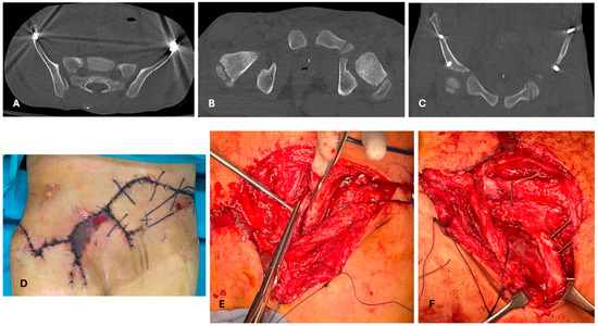 The same patient as Figure 1. CT check for planning, with ExFix in situ. (A–C) Triplanar reconstruction. (D) The image shows the situation at 5 days post-trauma and the time of definitive treatment. (E) Intraoperative findings: the Risser is completely detached from the iliac wing, starting from the posterior-superior iliac spine to the anterior third of the iliac wing. (F) Intraoperative finding after reduction in the iliac wing and Risser; fixation is performed with K-wires [25].
