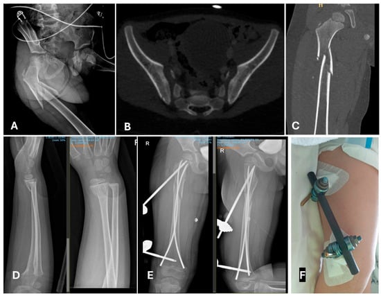 In some cases, a musculoskeletal lesion in PPT/PMT might be treated differently from the same lesion as an isolated injury. Fractures that are usually treated conservatively (e.g., femur shaft or humeral shaft fractures) have a low threshold for surgical fixation [69]. In the authors’ experience, this occurs mostly due to appropriate management of a multidisciplinary and complex patient, who needs more invasive procedures with different contamination settings and careful mobilization in the PICU; for the same reasons, when both internal and external fixation devices are possible options, the internal one might be preferred. However, in contrast to adults, the choice of a more aggressive approach to the fractures to achieve fast weight-bearing in critical children and babies is usually not an issue (Figure 5F–I and Figure 6E). Fractures in babies are almost always treated conservatively with casts and splints adapted for intensive monitoring or concomitant abdominal procedures. The use of circular/spica casts must be carefully applied in PPT/PMT during the first days: rapid body volume changes in NICU/PICU are rare. The identification of the source of pain might be particularly challenging with the patient under general anesthesia, and the diagnosis of compartment syndrome might be delayed or overseen. For these reasons, when both surgical and conservative treatment are an option, the indication could shift to surgery.
