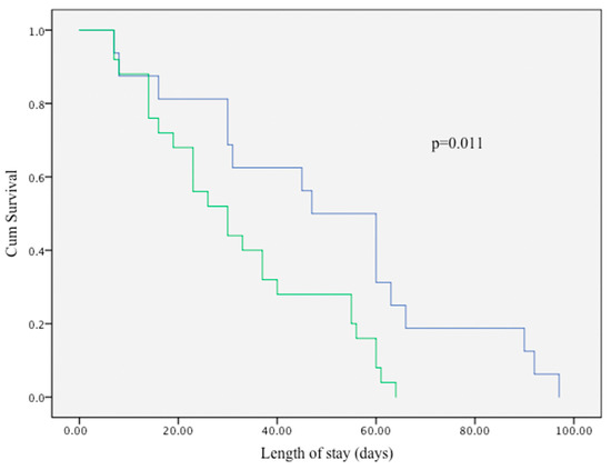 Figure 1. compares the length of NICU stay between infants who experienced LISA failure and those who did not. Infants in the LISA failure group (blue line) demonstrated a significantly longer duration of hospitalization compared to those with successful LISA outcomes (green line). The difference between the two groups was statistically significant (log-rank test,