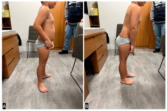 (A) Typical standing position of a patient who presented with a past neutral gastrocsoleus contracture. The patient abducts his legs and externally rotates his hips to achieve a comfortable position while standing, and is capable of completely touching the ground with both feet. (B) When asked to point his feet forward with his feet on the ground, the patient must lean forward to avoid falling back. This posture is highly predictive of severe gastrocsoleus contracture that requires casting or surgical treatment. (Clinical images from the personal files of Dr. Luiz de Angeli).