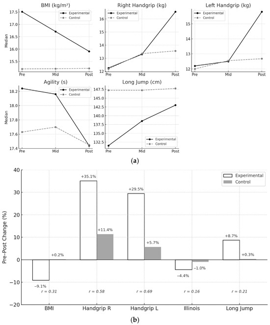 Figure 1 provides both the temporal evolution and the magnitude of changes induced by the intervention, a composite figure was constructed. Panel A displays the median trajectories for each outcome at pretest, mid-intervention, and posttest, facilitating the visualization of longitudinal trends. Panel B summarizes the net pre–post change for each group and outcome, including the effect size (