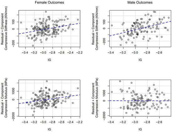 Figure 2 presents partial residual plots derived from the multivariable linear regression models. These plots illustrate a linear positive relationship between intensity gradient and both compressive modulus and stiffness among females and between intensity gradient and compressive stiffness among males.