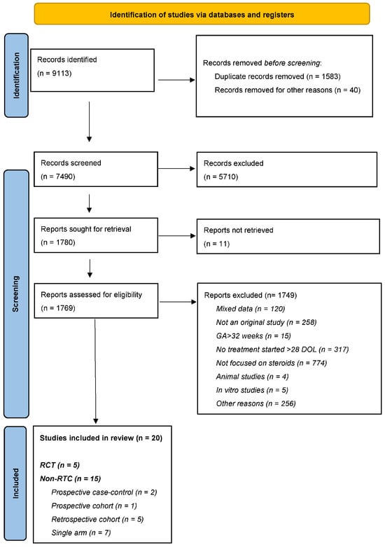 This systematic review included randomized trials, case–control studies, cohort studies, and case series that evaluated the use of postnatal steroids in preterm infants <32 weeks of gestation and diagnosed with established BPD [6]. Studies were included if steroid treatment was started 28 days of postnatal age, with no restrictions regarding formulation, dosage, or route. All definitions of BPD were included. Placebo or no treatment was considered the comparator. Also, studies with no control group (single-arm studies) were included in the systematic review but not in the meta-analysis.