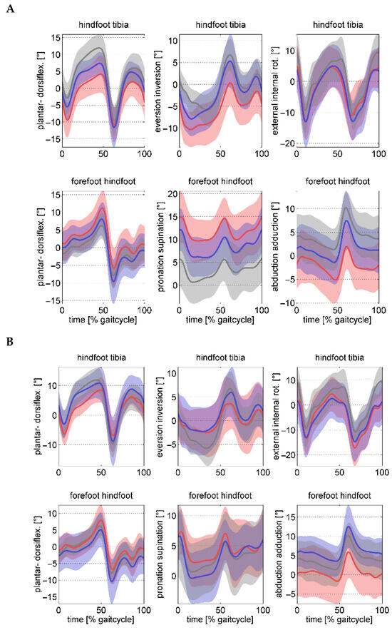 Foot kinematic waveforms preoperatively (A) and postoperatively (B) across the gait cycle. The FF group is represented in blue, the FFGR group in red, and the TD controls in grey. The shaded area indicates one standard deviation from the mean waveform.
