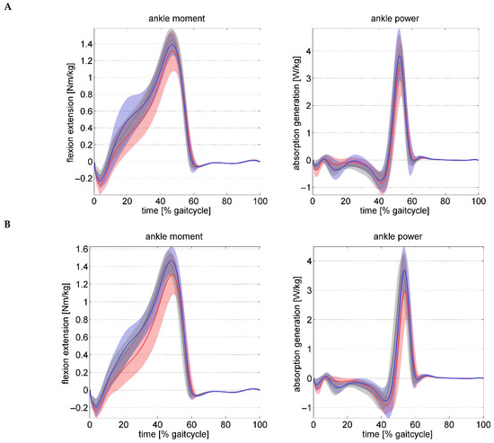 Ankle kinetic waveforms preoperatively (A) and postoperatively (B) across the gait cycle. The FF group is represented in blue, the FFGR group in red, and the TD controls in grey. The shaded area indicates one standard deviation from the mean waveform.