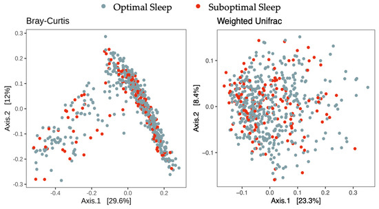 Bray–Curtis and Weighted UniFrac distance measures were used to compute overall gut microbiota composition. Less than 1% of the total variance in the overall gut microbiota composition was explained by sleep clusters according to both distance measures. No significant association was found between the overall gut microbiota composition and sleep clusters (Table 3 and Figure 2).