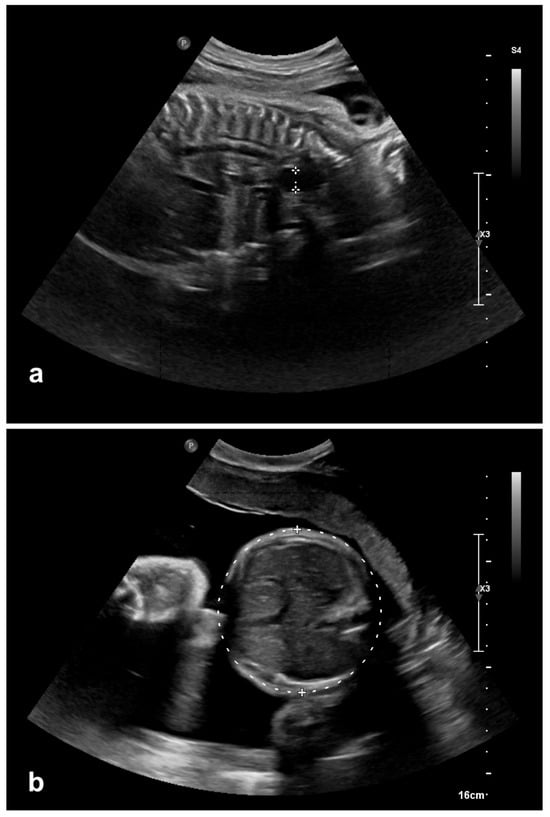 Figure 1. (a) “Pouch sign”—Prevertebral fluid accumulation inside the region of the neck/mediastinum, possibly suggesting esophageal atresia in gestational week 31. (b) Fetal ultrasound showing the absence of the stomach intraabdominally in gestational week 31.