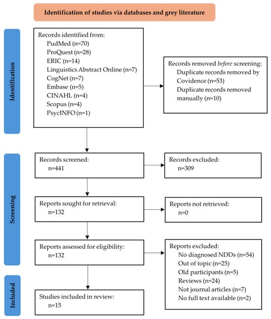 Following duplicate removal, initial title screening eliminated clearly irrelevant studies. Two reviewers independently screened the titles and abstracts of all retrieved studies for potential eligibility, and irrelevant studies not meeting the inclusion criteria were excluded. Studies were deemed eligible if they (i) involved participants aged 4–12 years with diagnosed NDDs, (ii) examined children with bilingual language exposure (i.e., defined as consistent exposure to or use of multiple languages in daily life), (iii) employed validated instruments for measuring cognitive or executive functioning, (iv) presented original empirical findings rather than reviews, and (v) were published in English. The restriction to English-language publications represents a limitation of this review and may have excluded relevant studies in other languages. The exclusion criteria were as follows: (i) studies lacking comparisons between groups; (ii) longitudinal studies; and (iii) preliminary reports such as protocols, conference abstracts, or incomplete dissertations.