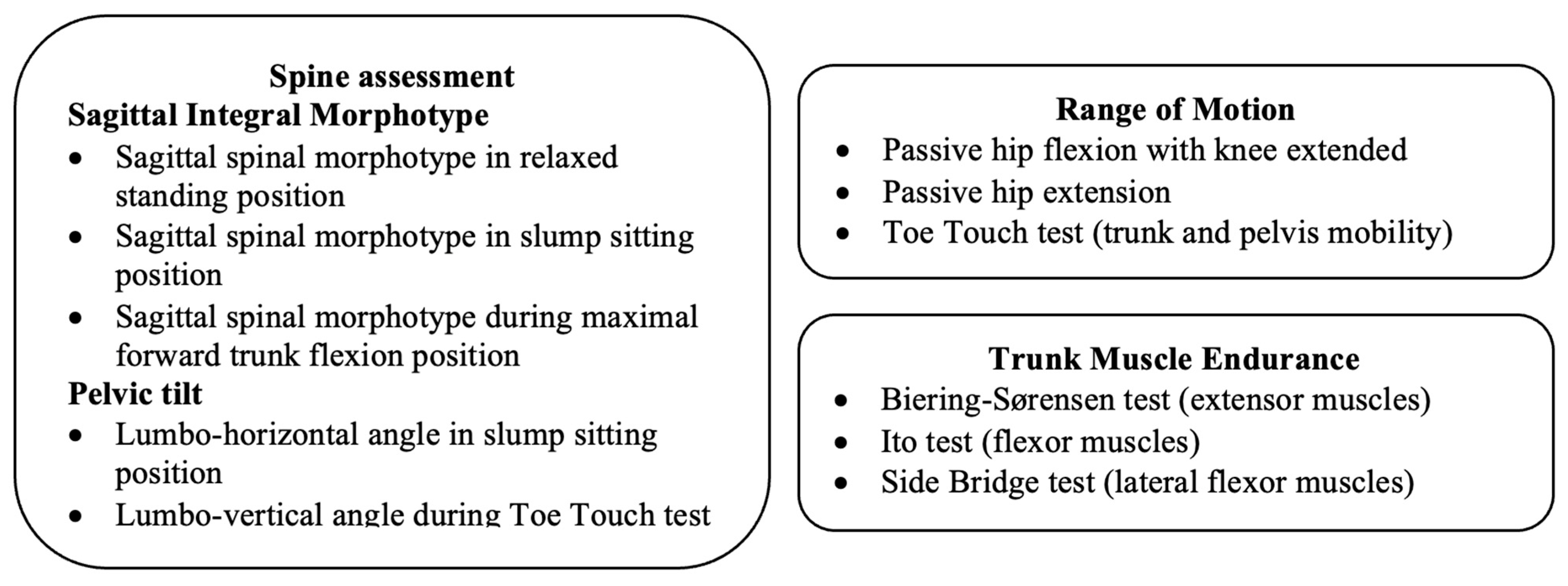 - Aartun, E.; Hartvigsen, J.; Hestbaek, L. Validity of Commonly Used Clinical Tests to Diagnose and Screen for Spinal Pain in Adolescents: A School-Based Cohort Study in 1300 Danes Aged 11-15 Years. J. Manip. Physiol. Ther. 2016, 39, 76–87. [Google Scholar] [CrossRef]