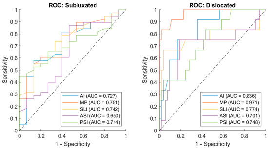 Evaluating the 3DAI method to conventional radiographic measurements, we identified a high correlation between all three 3DAI and the conventional radiographic metrics MP and AI (all p < 0.001), with the SLI displaying the strongest correlation (Figure 3). ROC analysis indicated that MP possessed the best discriminative performance in distinguishing both subluxated and dislocated cases from stable hips with a high to very high diagnostic precision (subluxated group AUC = 0.751 and dislocated group AUC = 0.971) (Figure 4). The 3DAI and the AI performed comparably well (AUC = 0.650–0.836). The MP shows the best predictability in dislocated hips (sensitivity 83.30% and specificity 98.10%) (Table 5).